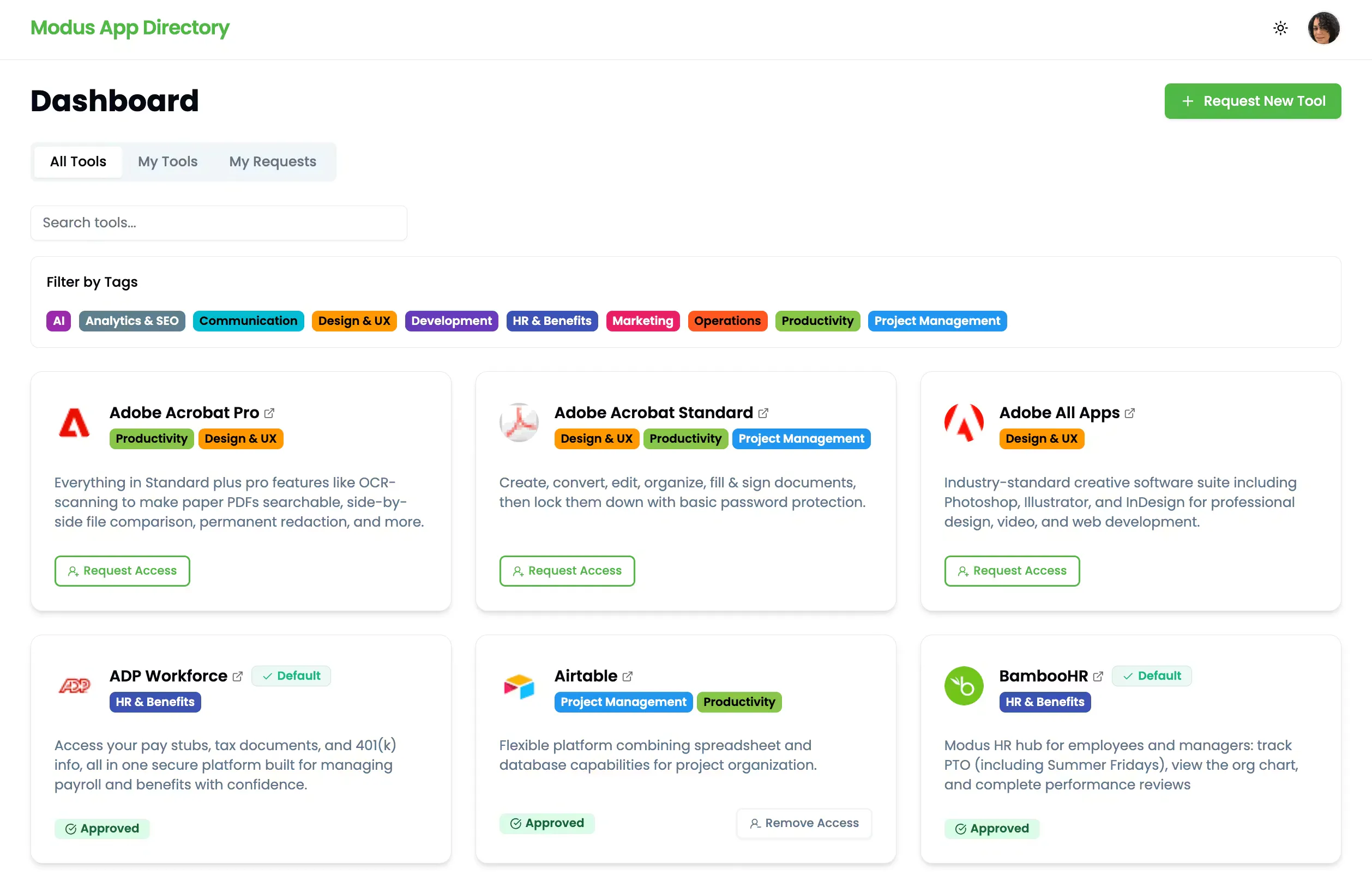 App Directory is our custom-built answer to the limitations of our old system. At its heart is an intelligent workflow that guides employees from request to approval with automated notifications and a clear history. Users can browse a central catalog of available applications, see what they already have, and request new apps with a single click.